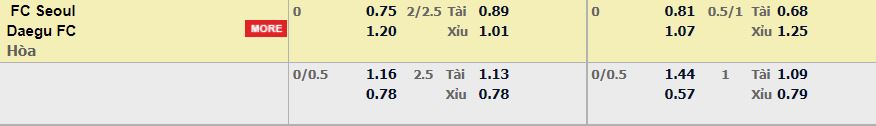 - Mức kèo chấp: Seoul ăn 0,75. Daegu ăn 1,20
