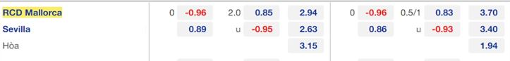 - Mức kèo nhà cái cược chấp trận này: Hòa – Được – Thua. Mallorca ăn 1,00. Sevilla ăn 0,89