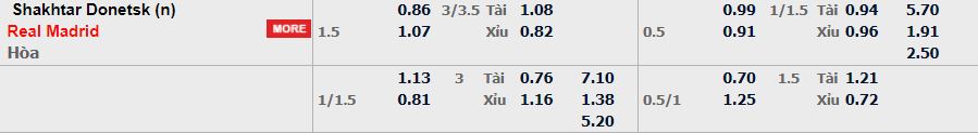 - Mức kèo nhà cái cược chấp trận này: Real Madrid chấp 1,5 trái. Shakhtar Donetsk ăn 0,86. Real Madrid ăn 1,07