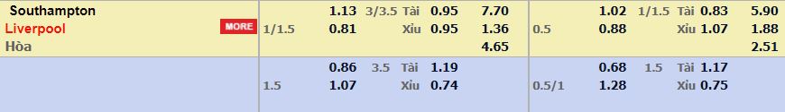 - Mức kèo nhà cái cược chấp trận này: Liverpool chấp 1,25 Trái. Southampton ăn 1,13. Liverpool ăn 0,81