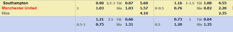 - Mức kèo nhà cái, tỷ lệ kèo bóng đá cược chấp trận này: Manchester Utd chấp 1 Trái. Manchester Utd ăn 1,03. Southampton ăn 0,90