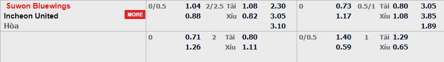 Tỷ lệ cược Suwon Bluewings vs Incheon – 17h30 – 03/07/2022