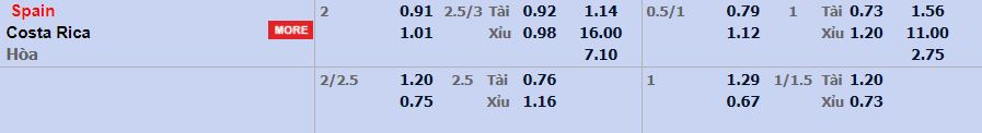 Kèo châu Á đưa ra mức cược Tây Ban Nha chấp Costa Rica 1,5 bàn ở trận đấu này. La Roja có những Morata hay Asensio là những người luôn tỏa sáng trước các đối thủ yếu hơn. Do vậy, thắng lợi là điều tất yếu và sẽ là 1 chiến thắng cách biệt nếu Tây Ban Nha tận dụng cơ hội tốt. Kèo tài xỉu 2,5-3 bàn là dấu hiệu cho thấy trận đấu dễ có nhiều bàn thắng. Costa Rica đã thể hiện khả năng ghi bàn tốt trong 4/5 trận gần nhất (trung bình 2 bàn/trận). Tuy vậy, Tây Ban Nha rất khó chịu với lối chơi kiểm soát bóng cao nên khả năng Costa Rica đóng góp bàn là không cao. Nhưng giới chuyên gia dự đoán 1 mình Tây Ban Nha cũng đủ để khiến trận đấu này nổ tài trong 1 ngày hàng công thi đấu thăng hoa.