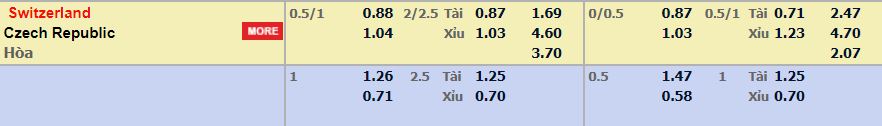 - Mức kèo nhà cái cược chấp trận này: Thụy Sĩ chấp 0,75 Trái. Thụy Sĩ ăn 0,88. Cộng hòa Séc ăn 1,04