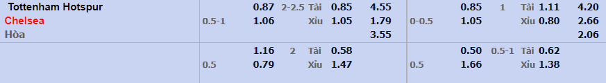 - Mức kèo nhà cái cược chấp trận này: Chelsea chấp 0,75 Trái. Tottenham Hotspur ăn 0,87. Chelsea ăn 1,06