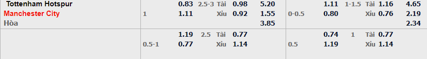 - Mức kèo nhà cái đưa ra trận này: Manchester City chấp 1 Trái. Manchester City ăn 1,11. Tottenham Hotspur ăn 0,83