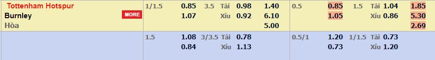 - Mức kèo nhà cái cược chấp trận này: Tottenham chấp 1,25 Trái. Tottenham ăn 0,85. Burnley ăn 1,07