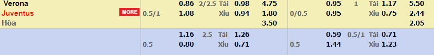 - Mức kèo nhà cái cược chấp trận này: Juventus chấp 0,75 trái. Verona ăn 0,86. Juventus ăn 1,08
