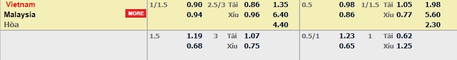 - Mức kèo nhà cái cược chấp trận này: Việt Nam chấp 1,25 Trái. Việt Nam ăn 0,90. Malaysia ăn 0,94