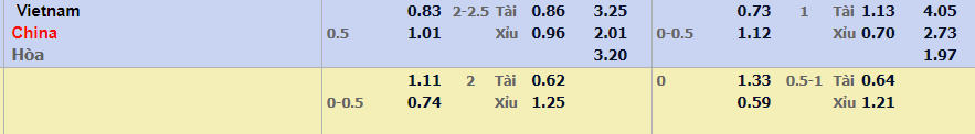 - Mức kèo nhà cái cược chấp trận này: Trung Quốc chấp 0,5 Trái. Việt Nam ăn 0,83. Trung Quốc ăn 1,01