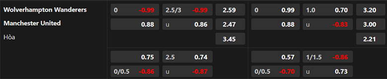 - Mức kèo nhà cái cược chấp trận này: Hòa – Được – Thua. Wolves ăn 1,00. Manchester Utd ăn 0,88