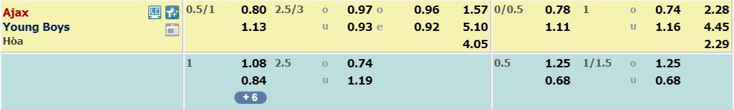 - Mức kèo bóng đá cược chấp nhà cái đưa ra cho cả trận: Ajax Amsterdam chấp 0,75 trái. Ajax Amsterdam ăn 0,80. Young Boys ăn 1,13