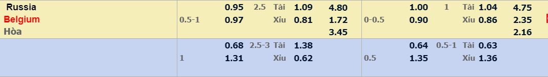 - Mức kèo nhà cái cược chấp trận này: Bỉ chấp 0,75 Trái. Nga ăn 0,95. Bỉ ăn 0,97