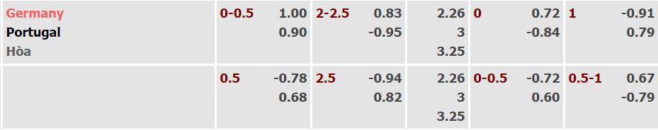- Mức kèo nhà cái cược chấp trận này: Đức chấp 0,25 trái.Đức ăn 1,00. Bồ Đào Nha ăn 0,90