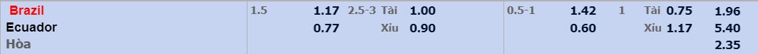 - Mức kèo nhà cái cược chấp trận này: Brazil chấp 1,5 Trái. Brazil ăn 1,17. Ecuador ăn 0,77