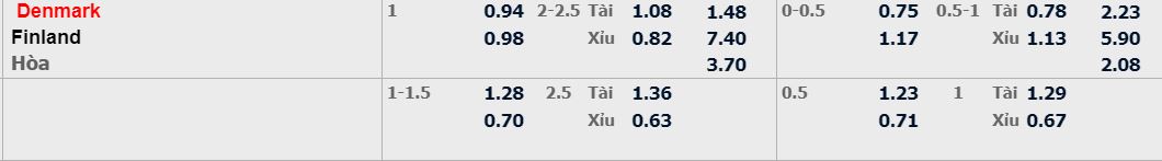 - Mức kèo nhà cái cược chấp trận này: Đan Mạch chấp 1 Trái. Đan Mạch ăn 0,94. Phần Lan ăn 0,98