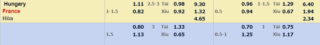 - Mức kèo nhà cái cược chấp trận này: Pháp chấp 1,25 trái. Hungary ăn 1,11. Pháp ăn 0,82