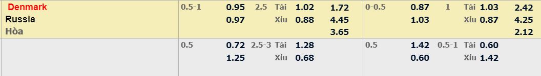 - Mức kèo nhà cái cược chấp trận này: Đan Mạch chấp 0,75 trái. Đan Mạch ăn 0,95. Nga ăn 0,97