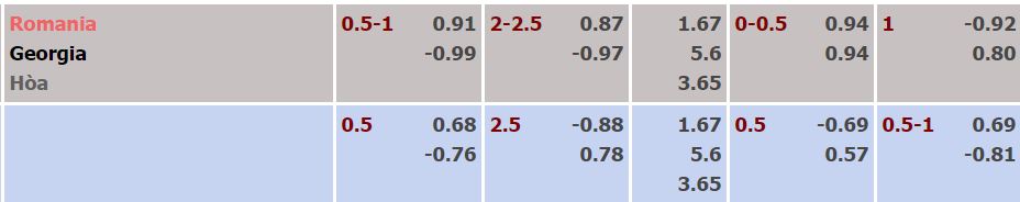 - Mức kèo nhà cái cược chấp trận này: Romania chấp 0,75 Trái. Romania ăn 0,91. Georgia ăn 1,00