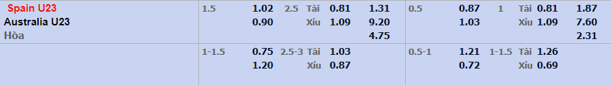 - Mức kèo nhà cái đưa ra trận này: U23 Tây Ban Nha chấp 1,5 trái. U23 Tây Ban Nha ăn 1,02. U23 Úc ăn 0,90