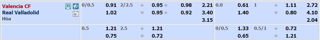 - Mức kèo nhà cái cược chấp trận này: Valencia chấp 0,25 Trái. Valencia ăn 0,91. Real Valladolid ăn 1,02