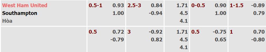 - Mức kèo nhà cái cược chấp trận này: West Ham chấp 0,75 Trái. West Ham ăn 0,93. Southampton ăn 1,00